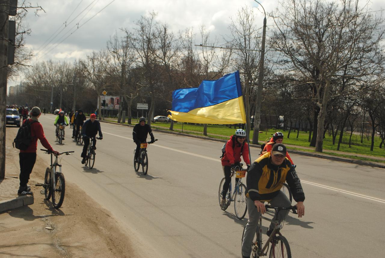 На первом фото - первая толпа веллеров, а на втором просто дядька с флагом. Ехать ему будет с ним ооочень тяжко, еле педали крутил против ветра.