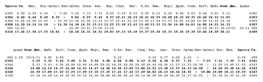 В первой группе -- общее расписание на участке Одесса -- Белгород Днестровский.