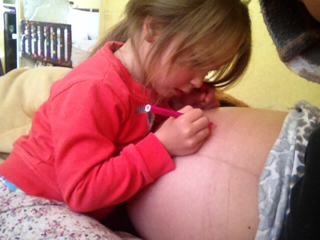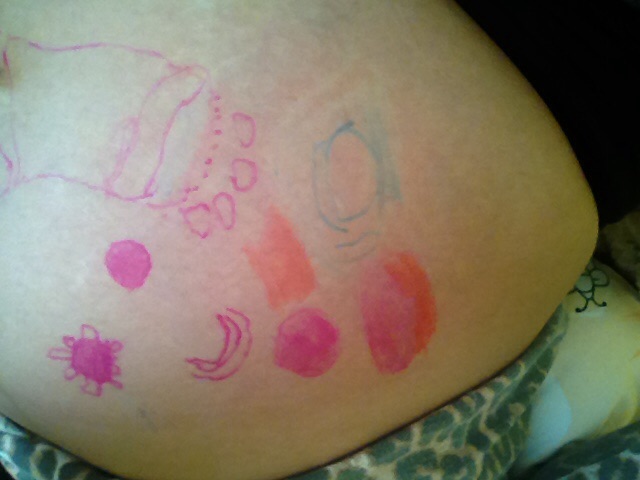 Красиво разрисован животик, очень даже позитивно не то что мне моя доця пока сидели на карантине рисовала живот исключительно тем же чем и я ее- зеленкой и синькой )))) я очень переживала что живот не отмоеться когда надо будет идти к гине, а то она бы думаю очень удивилась ))) но в отличии от доци я быстрее отмылась!!!!
