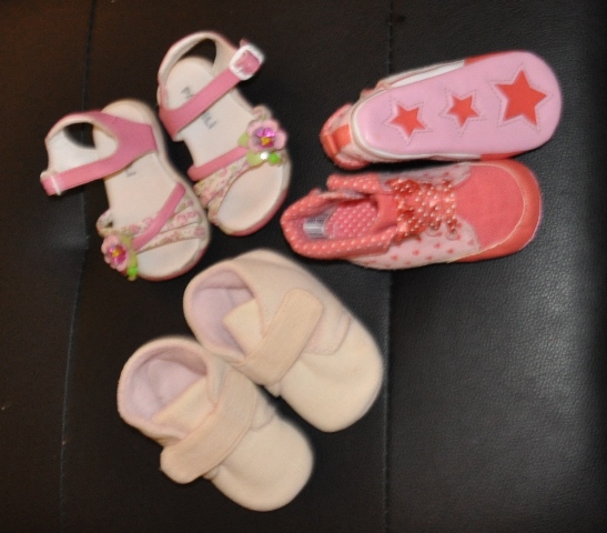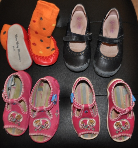 5. для самых маленьких носочки-пинетки р. 20; черные кожаные туфли (носки сильно стерлись, можно кремом замазать) р. 26; тапочки розовые Зетпол р.20 и р. 22