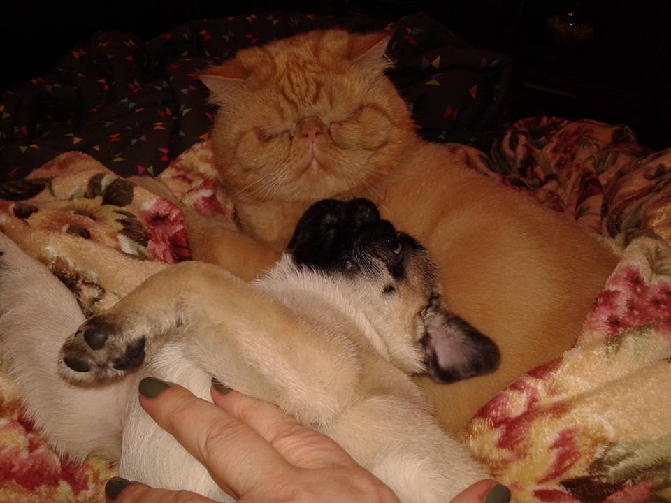 Вот у всех кот с собакой ладят. А у нас мопся просит поиграть с котом, а кот бьет ее по морде, сгоняет с кровати, не дает зайти в комнату - показывает кто в доме хозяин))