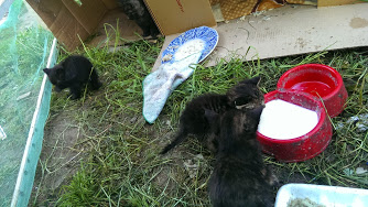 Как они сразу не погибли - неизвестно. Местные детишки сказали, что кошка была, но ушла пару дней назад. Всеми силами мастерят им загончик, чтоб не разбегались, приносят молоко и корм.