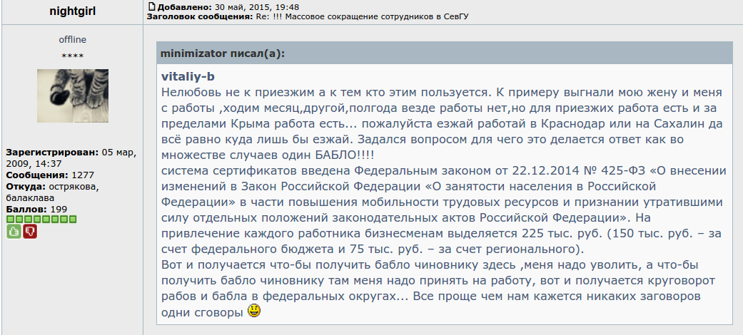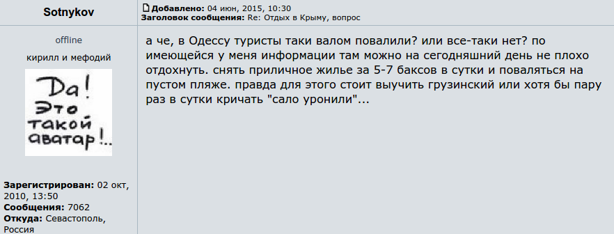 Мне вон с крымнаша написала знакомая, бизнес у них еще в прошлом году загнулся (Джанкой), но дали типа компенсации на этот год (счастья полные штаны) и муж нашел работу в гос. конторе, зарплата 30 штук, говорит - на все хватает, всем довольны. Украину не хотят, никаких "притеснений" не ощущают (она татарка).