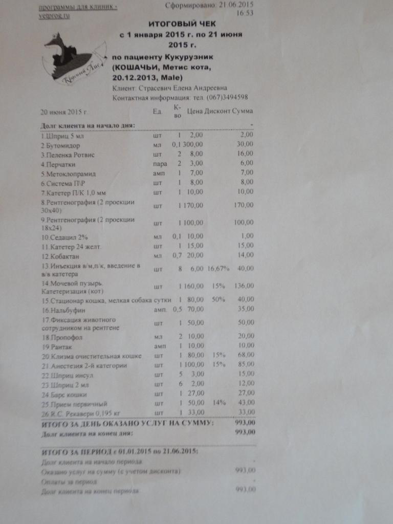 В четверг, идя с работы, нашла кота, сбитого машиной, он от шока забежал под выступ перед магазином и по плитке стекала кровь, это было на проспекте Гагарина/Сегедской, понесли его с девочкой в ветеринарную клинику на Гагарина/Шевченко, там нам сказали, что у него скорей всего перелом в тазобедренной кости и сильный ушиб яичек, сильно содралась там кожа(откуда и лилась кровь), но вроде как жизненно важные органы не повреждены, сказал сделать рентген и посмотреть нужна ли операция со штифтом, повезли его в клинику на Леваневского, где после рентгена сказали, что у него ушиб и ему нужно просто отлежаться, укололи ему антибиотик. Повезли его к девочке на передержку. Огромное спасибо девочке Анжеле и двум мальчикам, которые мне помогали в четверг и возили кота по больницам. На второй день (в пятницу), он сильно начал плакать, никого не подпускал к себе, шипел, после этого решили отнести его в "Красный лис" на Варненской (спасибо Леночке, которая помогла в мое отсутствие отнести его туда). Там ему еще раз делали рентген, узи, так как была уверена, что с ним все в порядке, с Леваневского я рентген не забрала. Рентген и узи в Красном лисе показали, что у него забит кишечник и переполнен мочевой, перелом, и сильные гематомы, сгустки крови перекрыли мочеточник и поэтому он не может сходить в туалет. Но точный диагноз и заключение дали в субботу, так как забитый кишечник не давал возможности рассмотреть лучше перелом. Дали ему согласие на наркоз, чтобы с помощью катетера выпустить мочу. Катетер вставили, мочу выпустили, сделали клизму, забит кишечник был кукурузой, за это его прозвали там Кукурузником. Новый рентген показал, что перелом, в принципе, срастется, и кот ходить будет, но есть одно "но", если не сделать в ближайшее время операцию, то мозоль от сросшейся кости перекроет кишечник, останется совсем маленький просвет и он не сможет пожизненно сам ходить в туалет. Если ее не сделать в ближайшее время , пока кость не срослась, то придется потом заново ломать кость и операция будет в разы дороже. На данный момент (не учитывая сегодняшнего дня) долг в «Красном лисе» составляет 993,00 грн. Кот себя чувствует лучше, находится в клинике. Катетер вынули, но из-за травмы и ранее переполненного мочевого он (мочевой) пока в атоническом состоянии. Завтра буду узнавать в каких клиниках можно сделать операцию, так как они пока такие операции не делают. Не представляю в какую сумму мне это выльется в дальнейшем, я просто одна не потяну, т.к. на работе проблемы, а дома куча животных. Все чеки я буду выкладывать. Отчет о поступивших и потраченных на кота средствах будет предоставлен. Даже пару рублей может очень помочь. Кот Кукурузник, белый и пушистый с черной точкой на голове, записан на Лену Страсевич. Если кто-то будет рядом с «Красным лисом» на Варненской 20 и захочет помочь Коту Кукурузнику, буду безумно всем благодарна.