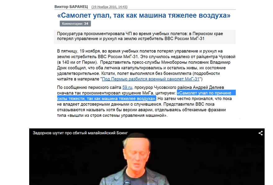 Михаил Задорнов теперь включил в свои концерты шутку про сбитый малазийский "Боинг". Зал хохочет: это же так смешно, что погибли 300 человек, из них 80 детей. Обхохочешься.