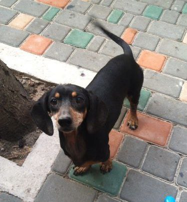 Найдена собака, такса, сука, окрас черный с рыжим подпалом.