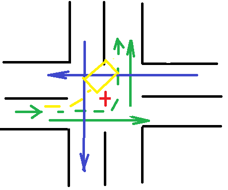 Если вы не видите разницу между желтой и зеленой траекторией, то поясню - зеленая траектория огибает центр пересечения справа, а желтая слева!