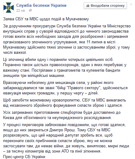То, что произошло в Мукачево – это вызов легитимности украинской власти. Если это не остановить сейчас, в следующий раз стрелять из гранатомета будут в центре Киева, прикрывая это все сказками о патриотизме и наказании коррупционеров.