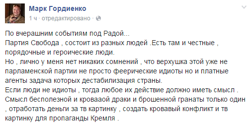 Самопоміч - агент Кремля, а оппоблок діє, згідно М2 (єдиний можливий правильний шлях) і тому патріоти, що днями-ночами думкою й ділами стоять на захисті інтересів України? Пробачте, але це пи#д#ць! Згодом автор оговтався і в наступному виступі щось пробуркотів нерозбірливо про "свою игру". У чому сенс цієї "игры" досить хороший аналітик чомусь не розкрив. Тля, та скажи ти як є: якщо не прийняли б той ОРДИЛОСОС, то Пороху б ЄС і США забабахали груповуху. Навіть Порох це озвучив у вчорашньому зверненні. Правда сорм'язливо втулив у середину промови. А насправді тре було саме це робити темою звернення і в ефір його випускати кожного дня на протязі місяця ДО, а не ПІСЛЯ. Казати без викрутасів: Якщо не приймемо, то всім нам великий триндець, всі нас кинуть напризволящще, а сил, щоб самостійно вишкарябатись у нас недостатньо. А не розповідати, як це добре для країни, і змішувати в одну кучу децентралізацію, за яку ВСІ і ОРДИЛОСОС. Оці воплі про "там жодного слова про особливий статус". Та достатньо відкрити й почитати закон - там функції далеко не місцевого самоврядування. Так, його вихолостили як змогли. То так і скажіть - зробили, що змогли, а не втірайте про "можна відмінити простою більшістю". Бо можна відмінити, невідмінити, а також внести поправку про свою армію, наприклад. Соррі за багатобукофф, але про Самопоміч - партію-прибічника х-ла і ОБ - щирих заукраїністів таки "взбодрило".