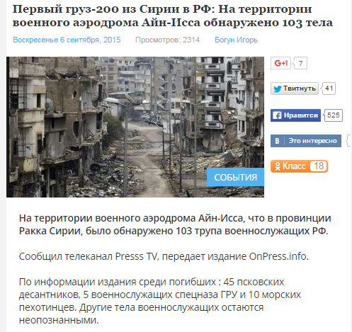 Не нашел подтверждения ни на Associated Press (там в общих словах о событиях в Сирии и Ракке- о погибших мирных жителях, словесной дуэли Керри и Лаврова ) ни слова о сотне+ трупов российских военнослужащих