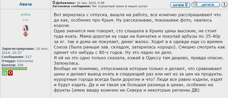 16. Из Севастополя пишут: “На примере своей семьи скажу, что несмотря на то, что оба работаем в достаточно стабильной сфере, всё равно упадок чувствуется. Крупные покупки делаем за счёт денег, заработанных до референдума”