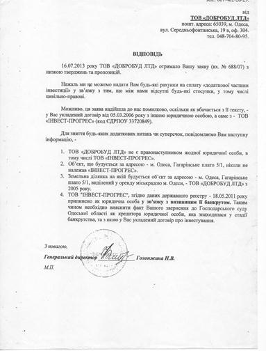 А теперь пример того, как г-жа Голонжина, будучи директором "Добробуд ЛТД", не хочет признавать купленные ранее квартиры за инвесторами ЖК "Гагарин Плаза". Идите, так сказать, в суд или в сад.