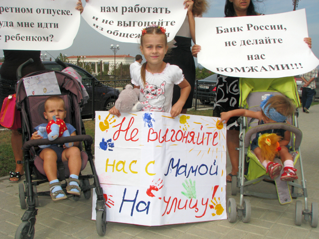 Организатором публичной акции выступила общественная организация «Защитим Севастополь». Они поддержали бывших сотрудников Севастопольского института банковского дела, которых новое руководство отказывается без объяснения причин принять на работу и выгоняет из общежития. Лишившись места проживания и прописки мамы с детьми таким образом автоматически становяться бомжами.