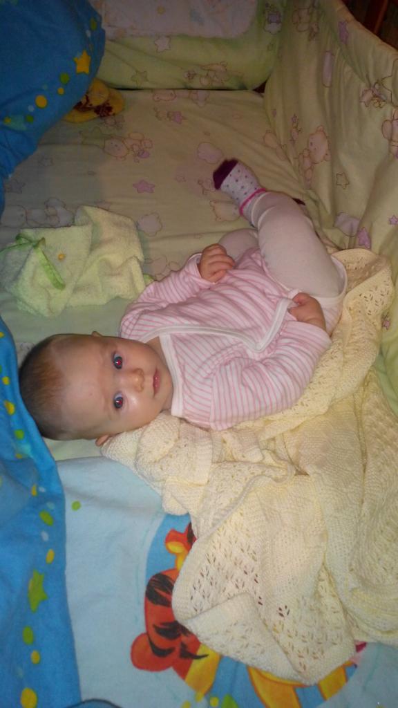 Да, уже подняла переднюю стенку кроватки, а она ногой там застряла. Вопила! Надо эту часть от бортика достать и привязать уже.
