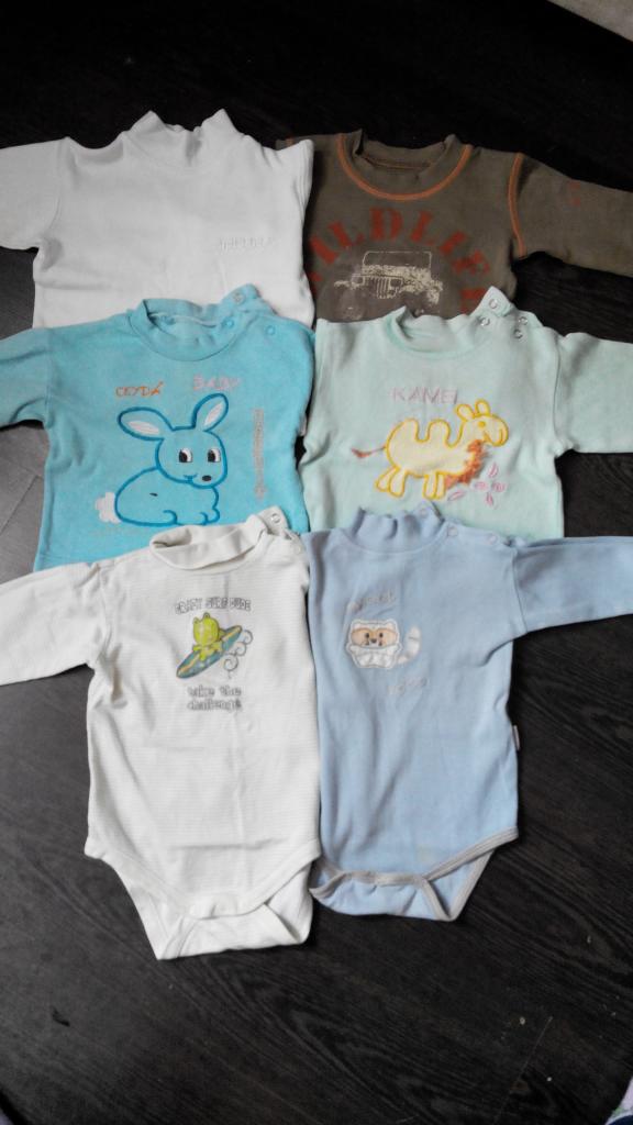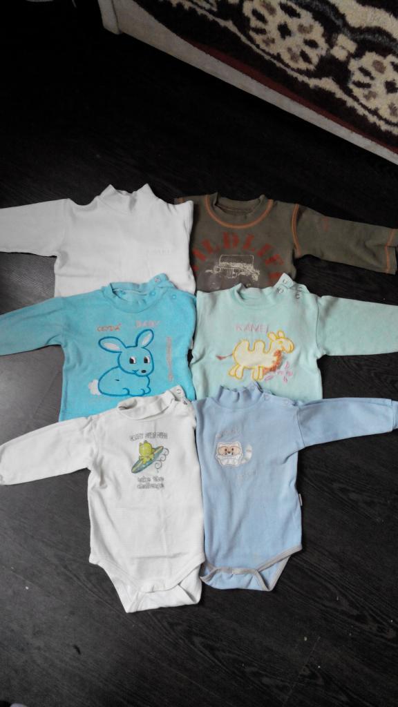 4 регланчика и 2 бодика .почти все с пятнышками кроме белого и коричневого.на одном нашла бирку 9-12мес все остальные обрезаны. есть кому пристроить????