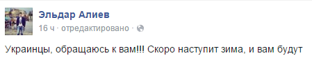 Украинцы, обращаюсь к вам!!! Скоро наступит зима, и вам будут жаловаться ватные крымчане, мол «мы ваши братья», а вы ведёте блокаду Крыма против нас. В Крыму нет - ни воды, ни света, ни вкусной еды, ни газа и вообще мы тут замерзли...