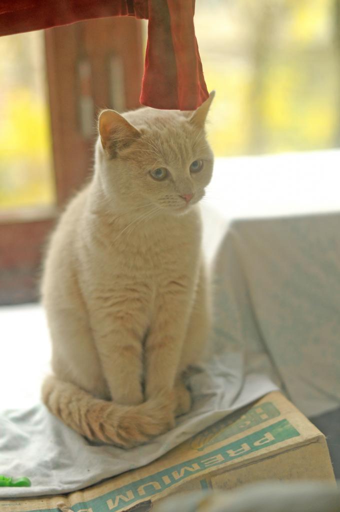 Окрас светлый бежевый. Явно домашний т.к. боится уличных котов, а людей не боится. Ухоженный, с удовольствием идет на ручки, ластится, спокойно ведет себя в квартире. Возможно, даже породистый.