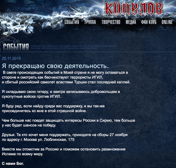 Концертный менеджер группы Евгений Одинцов заявил телеканалу LifeNews, что сообщение на сайте Валерия Кипелова написали неизвестные киберпреступники.