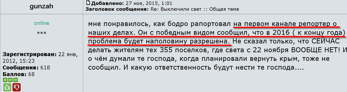 Я вот все время думаю :случись у нас (в Украине) такая ситуация (не дай Бог), что какое-то большое количество человек оказались отрезанными от света и прочих благ цивилизации - уже активизировались бы волонтеры, слали бы и слали генераторы, соляру, еду и т.д. А что россияне? Их граждане, которых они так торжественно принимали в свои ряды, находятся в ужасном положении - и тишина. Ни помощи от сограждан - ничего. Только полевые кухни, Пу на всех импровизированных экранах и прочий бред. Крымчанам стоит задуматься - так ли они нужны, вернее сказать, так ли их любят россияне. Но мне нравится, что предателям дали почувствовать свою ненужность. И дальше больше...