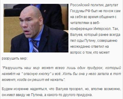 там не один он выступал в том же духе. разница с другими "праведно негодующими" выступающими в том, что он не говорил, что вова правильно говорит, что надо делать, а бояре эти правильные вовины слова игнорируют. так что в свете всего форума там все выглядит несколько иначе чем этот отдельный отрывок. общий фон выглядит так, что бояр распинает сверху вова, а снизу бизнес. видимо потому и гоняют единственный отрывок где про вову ни гугу