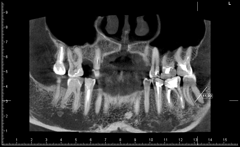 Карман может и небольшой, но костная деструкция в глубину на всю длинну дистального корня. В ширину миллиметров 10. То что намерено, это диагональ скорее, чем ширина. Еще с полгода подождать и зуб сам выпадет. Проблема так сказать сама пройдет.