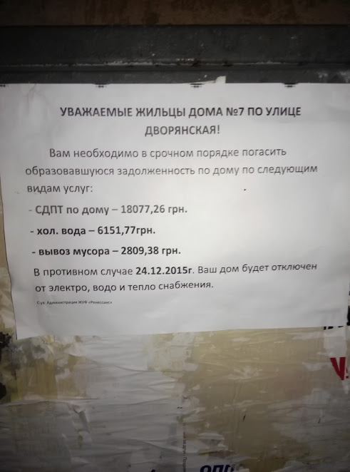 Самое отвратительное в этой ситуации то, что на самом деле эти дома вообще никто не обслуживает. Прошу маму пока не платить за СДПТ, плачу только за отопление, газ, воду и электричество, но эти гады развесили везде объявления с угрозами, что отключат всем и все, мама боится.