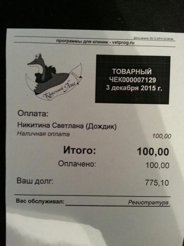 Занесла сегодня в клинику 100 грн (передали добрые люди). Вот чек. Долг действительно большой, после внесения 100 грн еще осталось 775 грн