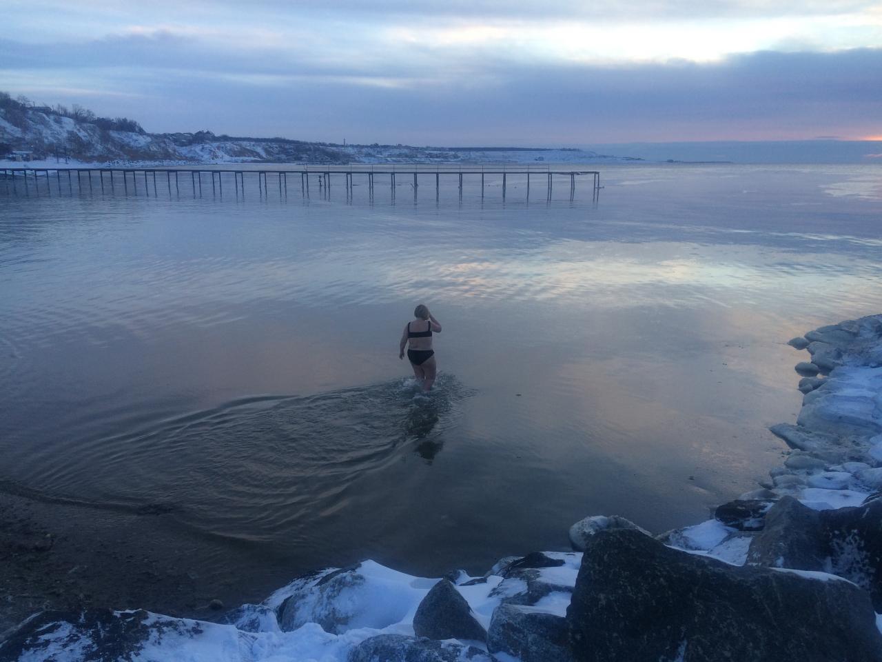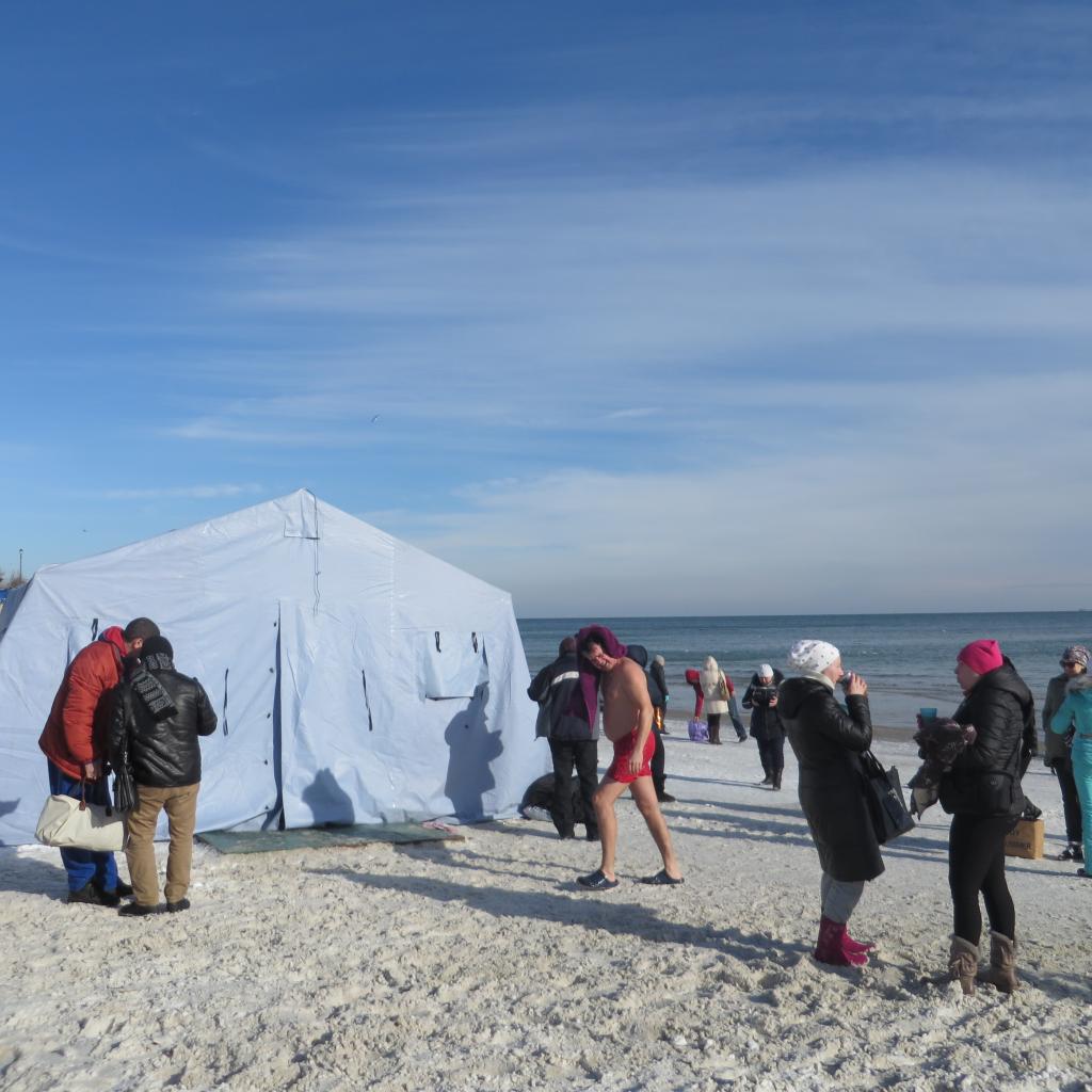 Ланжерон, можно спустится спокойно к морю, люди потянулись купаться в на Крещение, поставили палатки с буржуйками, вход свободный ))). Но я себе не изменяю, пошел купаться в Отраду к "Желтому камню", воздух -7С°, вода +1С°.