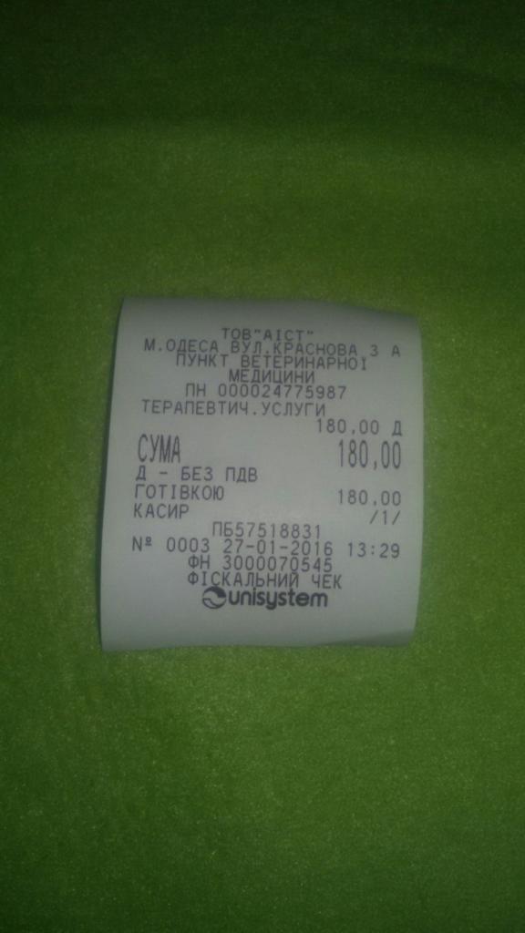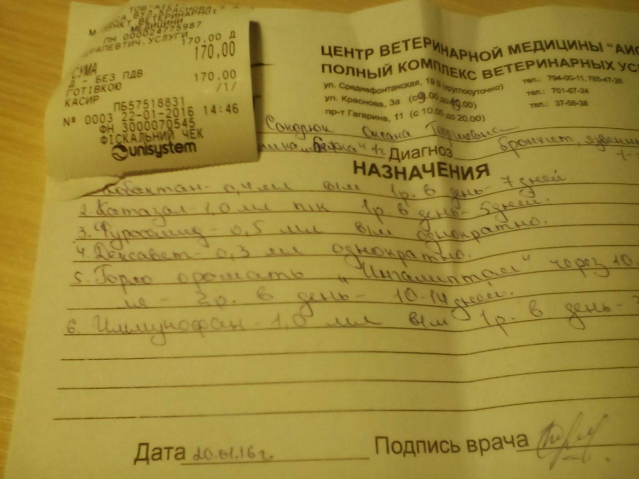 ID:	10790238 и два чека за лечение и обработки за 21.01.2016г. -150грн. и за 22.01.2016г. -170грн.Если кто-то сможет нам помочь лекарствами, будем очень благодарны. Нам сейчас нужны: 1.Кобактан; 2.Катазал; 3.Фоспренил; 4.Иммунофан.