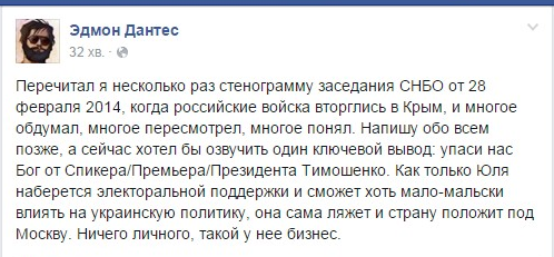Ага, теперь опять Тимошенко виновата... она одна! И против войны за Крым - если кто забыл: боеспособных войск в Украине при 150 000 числящихся было аж 6 000 против только договорных московских 25 000 - она одна выступила, а остальные просто промолчали... и режим ВП она одна НЕ ввела, а ЭТИ опять просто промолчали...)))