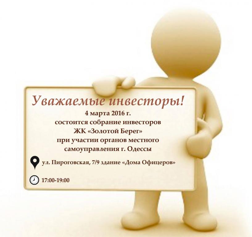 04.03.2016 г. состоится собрание инвесторов ЖК «Золотой Берег» при участии органов местного самоуправления г. Одессы.
