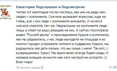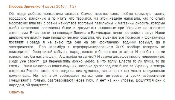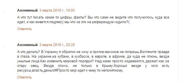 Все там, до банальности, просто. Они все прекрасно отдают себе отчет, кто виноват в аннексии, кто будет за это отвечать (рано или поздно) и что будет со всеми ними, когда вернется Украина. Каждый, каждый из них и мелкий чиновник, и крупный, и бабуля с дедулей, выжившие из ума....их всех найдут, по соц сетям, по свидетельству соседей, всех, кто махал аквафрешем, будут садить в вагоны и отправлять по несуществующему мосту в сторону мордора! Поэтому-то все они в диком страхе от ожидания, поэтому-то и говорят: не дай бог, может быть еще хуже чем на даунбассе, так что пусть лучше так, как сейчас, а сейчас оно конечно лучше, чем на дне керченского залива..... вот и вся их шкурная логика. Справедливости ради, надо сказать, что ссутся они не без основательно.