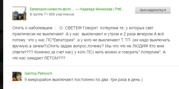 8. В Евпатории пришли к выводу, что те, кто готов потерпеть без света, являются счастливчиками, кому свет не отключают. Все остальные сидят на веерных подачах (скрин).