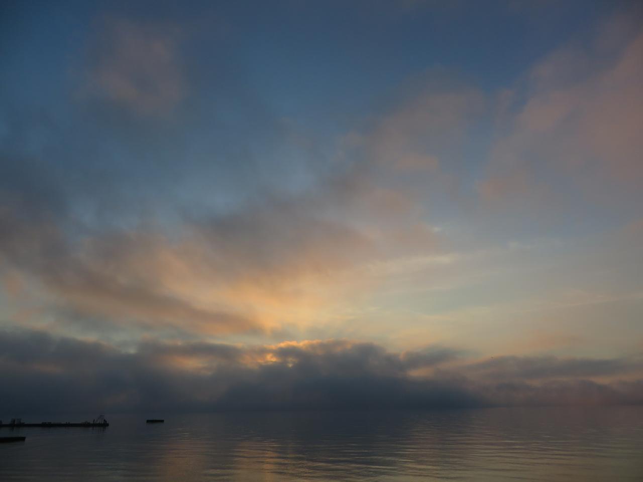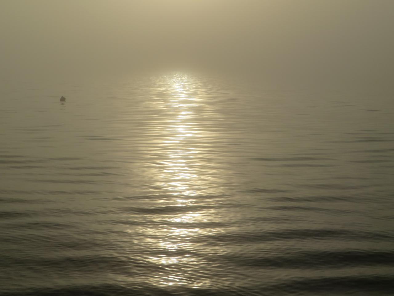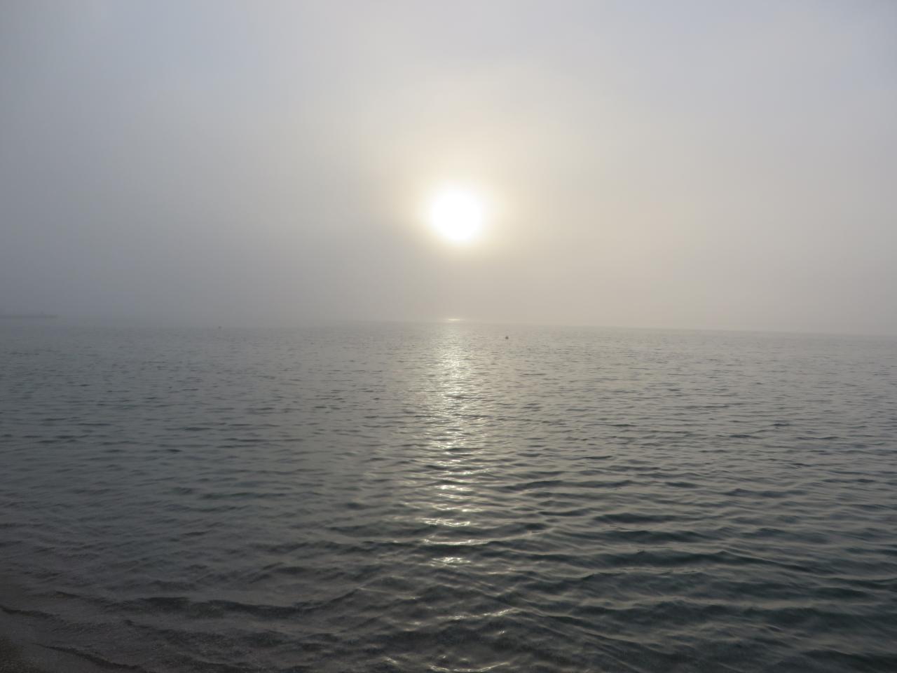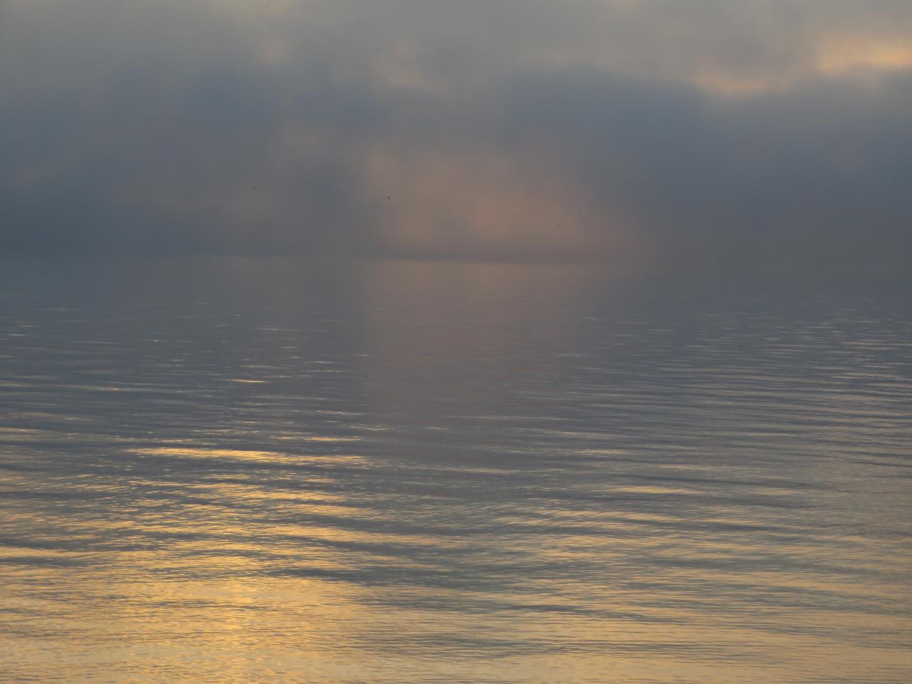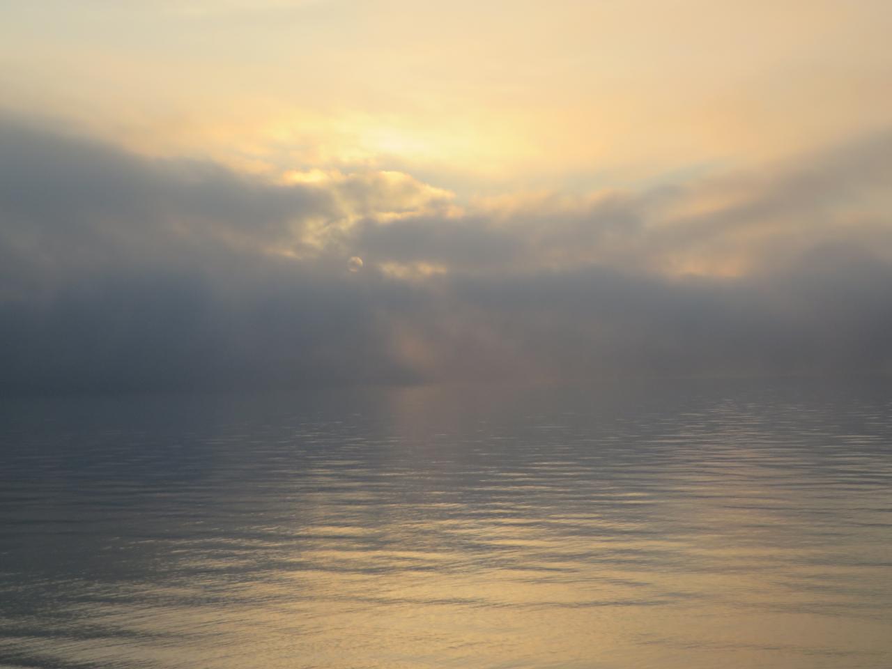 Необычный восход солнца. Нас посетила туманная королева, события развивались стремительно, из тёмной тучки клочья тумана стали стремительно обволакивать всё вокруг, видимость от 2 м. до 10 м., за 3 часа прогулки солнышко так полноценно на пробилось, водичка по прежнему нежно бодрящая.