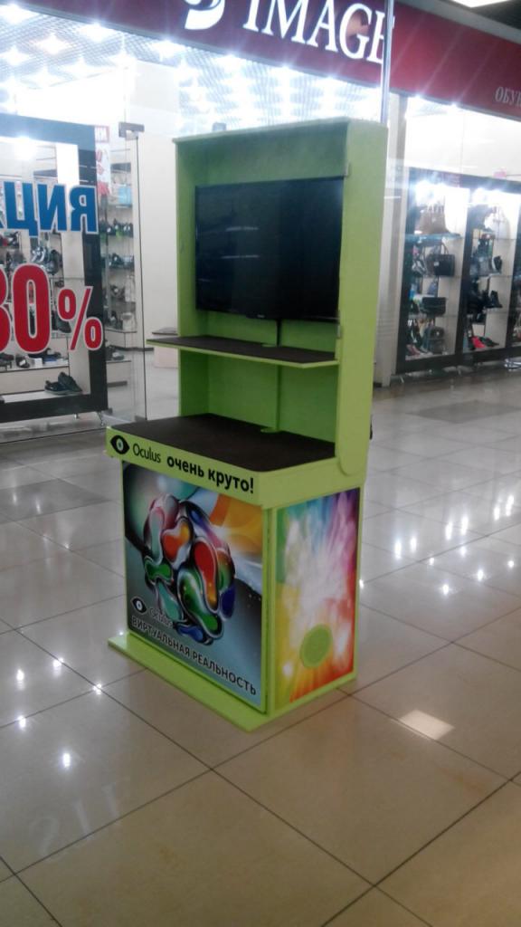 Это большой телевизор с приставкой которая одевается на голову. Вкупе это демонстрирует виртуальную реальность. Ставят такие штуки в больших торговых центрах.