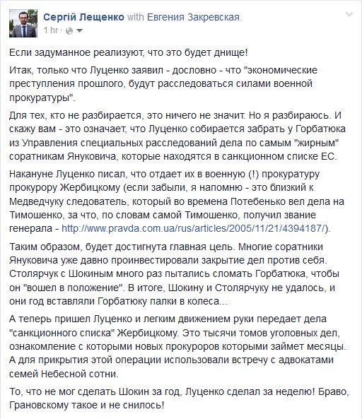 Ось пряма цитата нардепа від БПП Грановського про прокурора Лисенка: «Ця молода людина – досвідчений, талановитий і сильний прокурор, до послуг якого я інколи звертаюся. Він прекрасно знає інколи матеріали, які мене цікавлять».