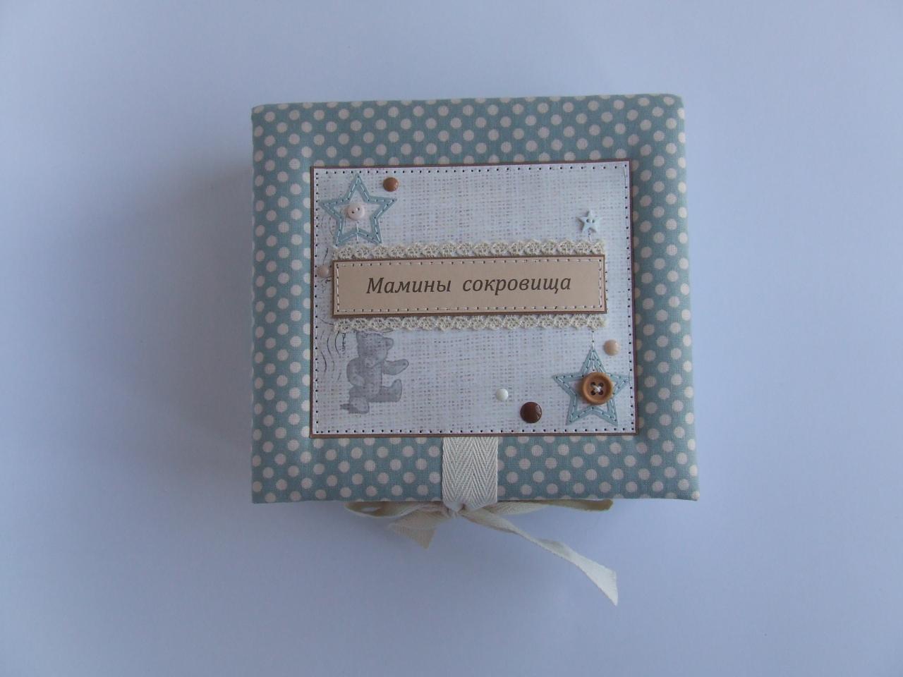 1. Мамины сокровища на три коробочки - бирочка, носочки, приятные мелочи, есть конвертик под первый локон и карточка для первого фото. Сделаны из плотного переплетного картона, обтянуты синтепоном и тканью ( мягенькие). Внешние размеры 16.5*14.5*7.5 см В наличии 350 грн.