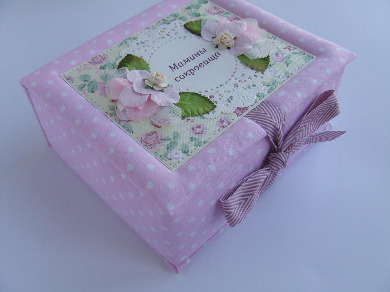 1. Мамины сокровища на три коробочки - бирочка, носочки, приятные мелочи, есть конвертик под первый локон и карточка для первого фото. Сделаны из плотного переплетного картона, обтянуты синтепоном и тканью ( мягенькие). Внешние размеры 16.5*14.5*7.5 см В наличии 350 грн.