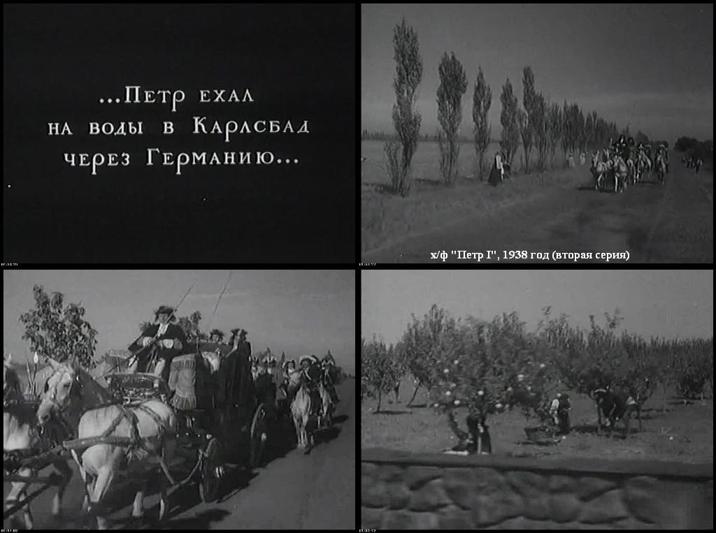 Режиссер картины Владимир Петров, снимая вторую серию "Петра I" в 1938 году, дает возможность нам заглянуть на 3/4 века назад и посмотреть как выглядел и участок Ново-Аркадийской дороги. По одну сторону - молодые тополя (за ними территория бывшей дачи Тработи), по другую каменный забор, а за ним яблоневый сад (территория бывшей дачи Гепнера).