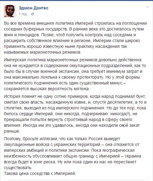 Понятно что этот вялотекущий триппер на востоке нашим властям выгоден, под него можно списать свои косяки, воровство и расширение полномочий спецслужб, прослушку и прочие признаки полицейского государства. Но ведь рано или поздно даже упоротые защитники петруши это поймут, что нам предложат следующее для замыливания глаз?