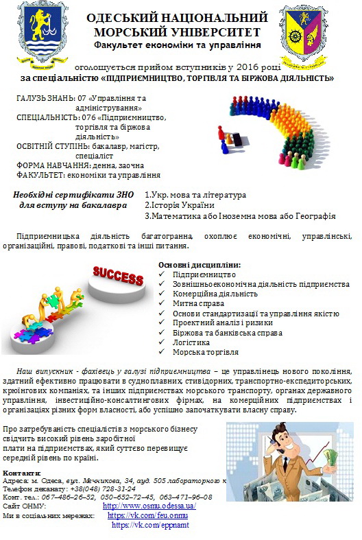 Наш выпускник - специалист в области предпринимательства - это управленец (владелец, руководитель, директор, менеджер) нового поколения, способный эффективно работать в судоходных, стивидорных, логистических и транспортно-экспедиторских, крюинговых компаниях и в администрации морских портов, других предприятиях морского транспорта, органах государственного и регионального управления, инвестиционно-консалтинговых фирмах, на коммерческих предприятиях и организациях различных форм собственности, или осуществлять биржевую деятельность или успешно начать собственное дело.