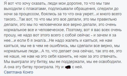 А вообще от себя добавлю, что я не склонна поливать Савченко последними словами, как сейчас делают очень многие. Я допускаю, что её мнение - не работа на кремль, а просто мнение отличное от нашего. Допускаю пока. Да, она мне подозрительна, но я не считаю её артисткой, которая долгие месяцы в сговоре с хутиным сидела в тюрьме, изображая жертву.