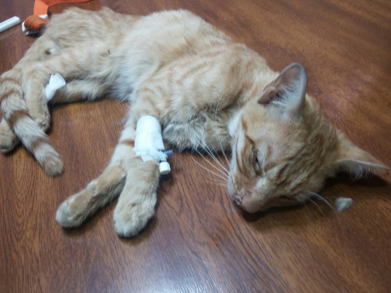 Я подобрала его вчера, когда гуляла с коляской. Он лежал тряпочкой на мокрой земле... Глаза были полностью залеплены коркой гноя, он еле дышал... Думала уже что он даже не доживет до утра.... Пришли домой, еле отмыли глаза, нос... Попыталась его попоить со шприца водой. Обнаружила что у него язвы везде.... Нос, рот, язык... и конечно же понятно что и желудок... Даже от глодка воды ему было ужасно больно! Он плакал при любом прикосновении к нему... А если не трогали его, он лежал и хрипел, как будто это были его последние секунды..... Я только молилась и надеялась что он доживет до утра! И он выжил! Утром соседка отвезла его в клинику Красный Лис. Сразу попытались взять анализ крови, из пару капель смогли выяснить только то, что у него все нормально с лейкоцитами, это уже хорошо. Ему очень СРОЧНО нужен донор крови! Потому что ему самому не справиться...... Пока понятно только что у него точно Кальцивироз и Ринотрахеит. А еще у него какое-то подкожное кровоизлияние... Я даже не пойму пока что это! Но кожа как в капельках крови... Остальные диагнозы будут ставиться позже, когда котик сможет хотя бы сам пить и можно будет взять кровь. Оставили его на капельницы, сказали что позвонят или вечером или уже завтра!