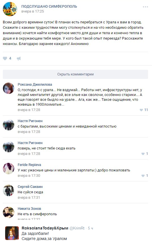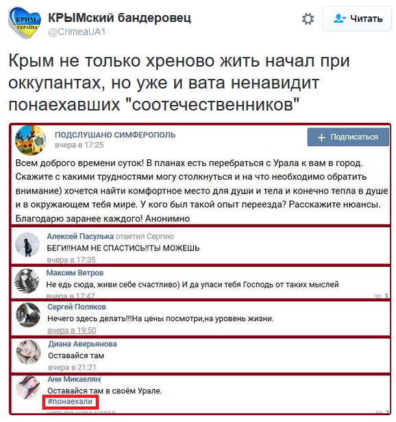 2. Вот ещё комментарии по призыву: “Да хрен им. Пусть воюют без нас”, “Мне вот лично не прикольно, меня 2 недели с детьми кто будет кормить?! Армия? Вот уж не думаю… Им надо, пусть сами и проходят свою подготовку”, “А вы надеялись, что «россию» другие «россияне» будут защищать?”, “Мне повестку вручили. Ухожу на днях. Офицер запаса 10 лет. Позвонили из военкомата, сказали, что у них бланки военников офицеров запаса появились, надо подойти. А вместе с военным билетом вручили повестку (таки сняли с поезда)”, “Это правда. В Севастополе тоже, переподготовка 20 дней”, “Сегодня в 3 ночи забрали парня (девочка знакомая рассказала). И он на смс не отвечает”, “Коллегу с работы забрали, внутренние войска”, “У меня много знакомых так забирают”, “Знакомый завтра уходит. 32 года, трое детей” https://twitter.com/CrimeaUA1/status/769263628176547846 (скрин и ссылка).