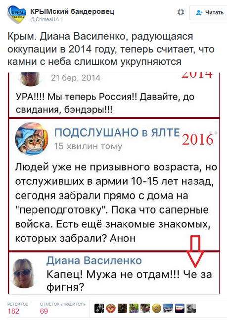 1. Оккупанты в Крыму снова начали рассылать повестки. Мы прослеживаем динамику Крымнаша головного мозга на примере крымской ватницы Дианы Василенко, которая в марте 2014 писала: “Ура!!! Мы теперь россия!! Давайте, до свидания, бэндэры!!!”, — а после начала призыва: “Капец! Мужа не отдам!!! Че за фигня?”. Радость от “гавани” так и прёт https://twitter.com/CrimeaUA1/status/769561625359777792 (скрин).