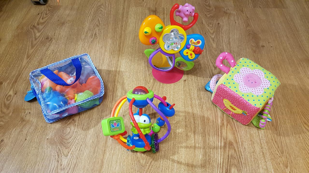 - игрушки (текстильный кубик, цветок на присоске, развивающий шар и брызгуны для купания). Также есть абсолютно новый мягкий медведь, с этикеткой.