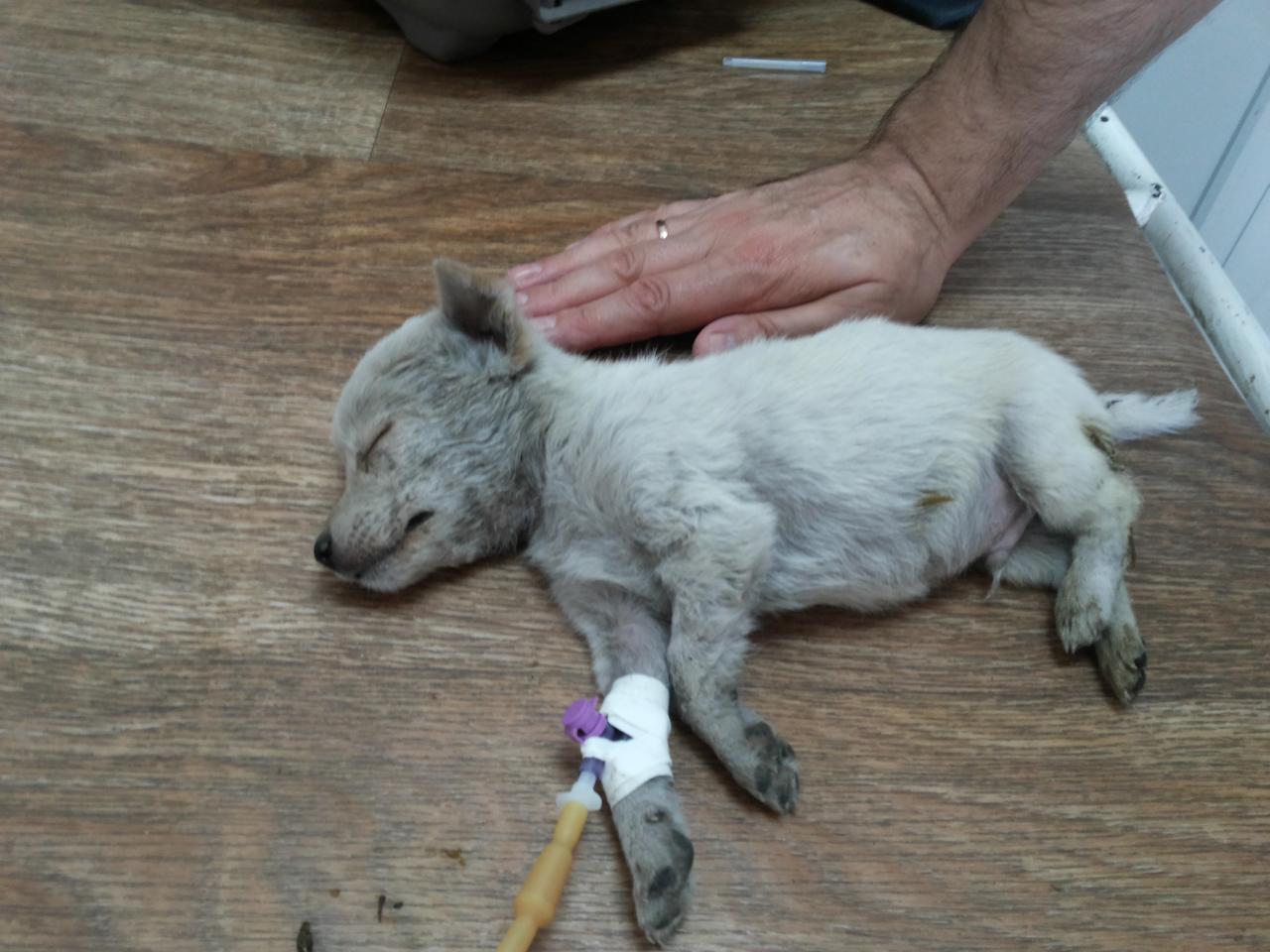 Это малыш был все таки рожден под счастливой звездой! В субботу этого кроху подобрал местный пастух и принес ко мне к вольеру, где у нас сидят щенки.Крохотный малыш был в коме, у него были судорги и он постоянно плакал от боли. Ему повезло дважды: в этот момент была с машиной Наташа Сафронова, его срочно доставили в НД. Прогноз был неутешительный, его укусил клещ и шансов было очень мало. 3 дня малыш был в коме, шансов нам практически не давали, но малыш, вес у которого был 480гр!!! победил. Он вышел из комы , но у него остались тяжелые последствия энцефалита: крошка слепой, он плохо , неуверенно ходит и заваливается на бок. Малышу назачено лечение на 21 день. Два раза в день его колю мильгамой и цераксоном, у нас есть небольшие, но успехи, он перестал плакать, он стал немного уверенне ходить и нам еще предстаит консультация у Резниченко, чтобы подтвердить диагноз