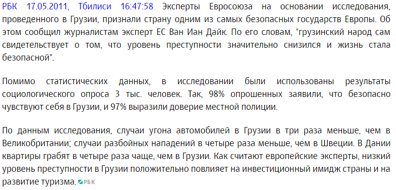 Недавно Саша Сотник вещал из Грузии, опрашивал людей про безопасность. Один грузин сказал, что оставил свою машину не запертой и не боится, что кто-то влезет. Грузия стала одной из самых безопасных стран мира.