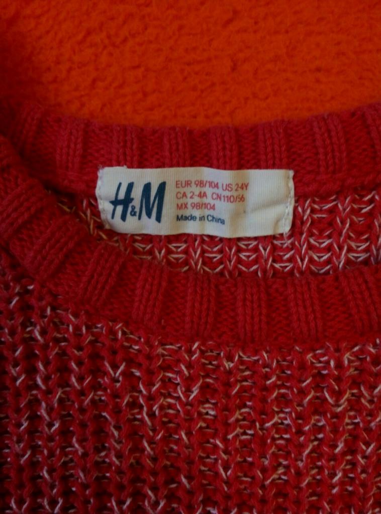 2) Свитер h&m, вязан., х/б, красного меланж.цвета, с карманчиком/вставка синего цв. размер указан 2-4г, 98-110см, Стильно смотрится! под джинсы/брюки темного цвета! - 150грн