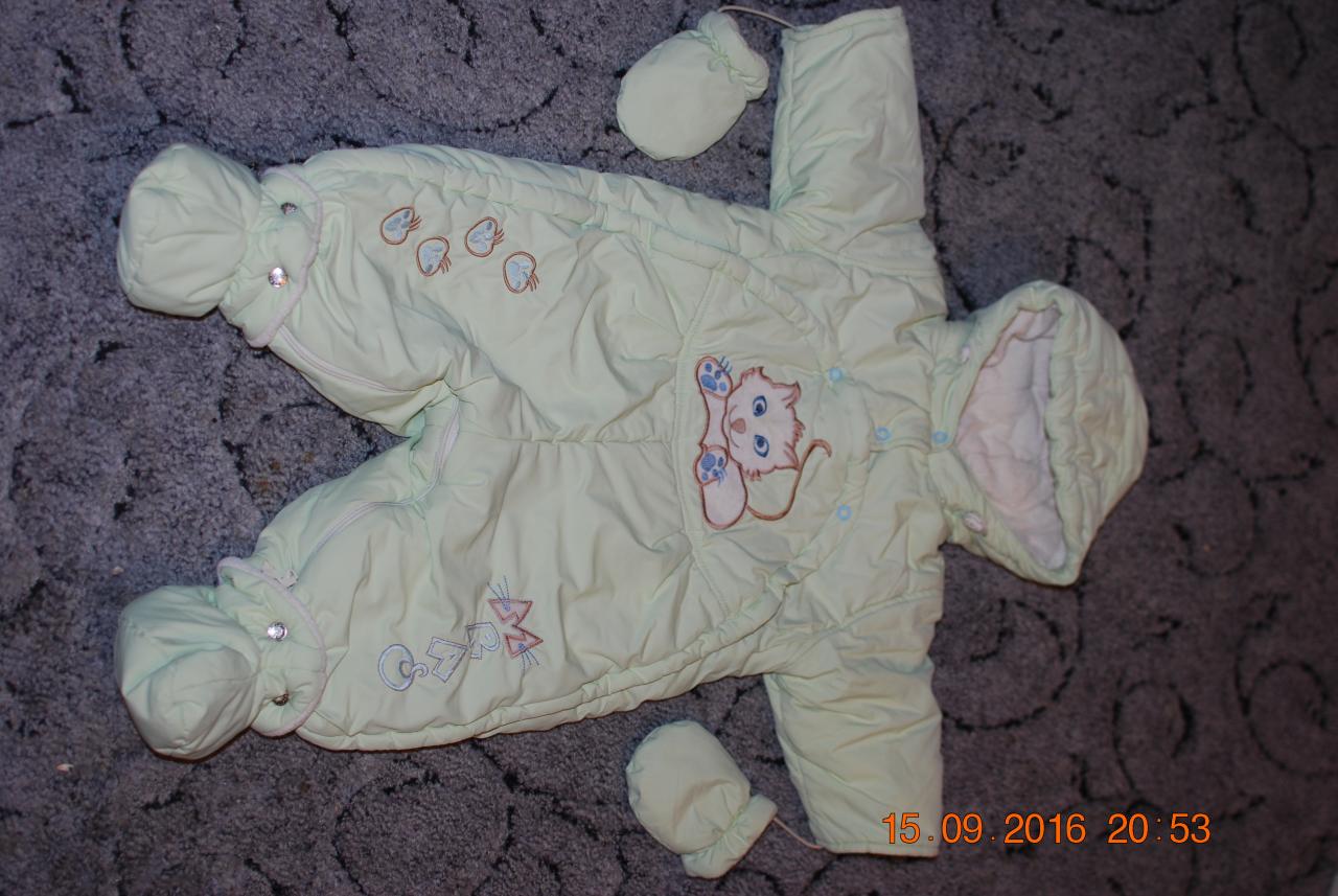 1 молочного цвета зимний комбезик на рост 62-68+шапка к нем, правда варежки были на пуговицах и я их не могу теперь найти((